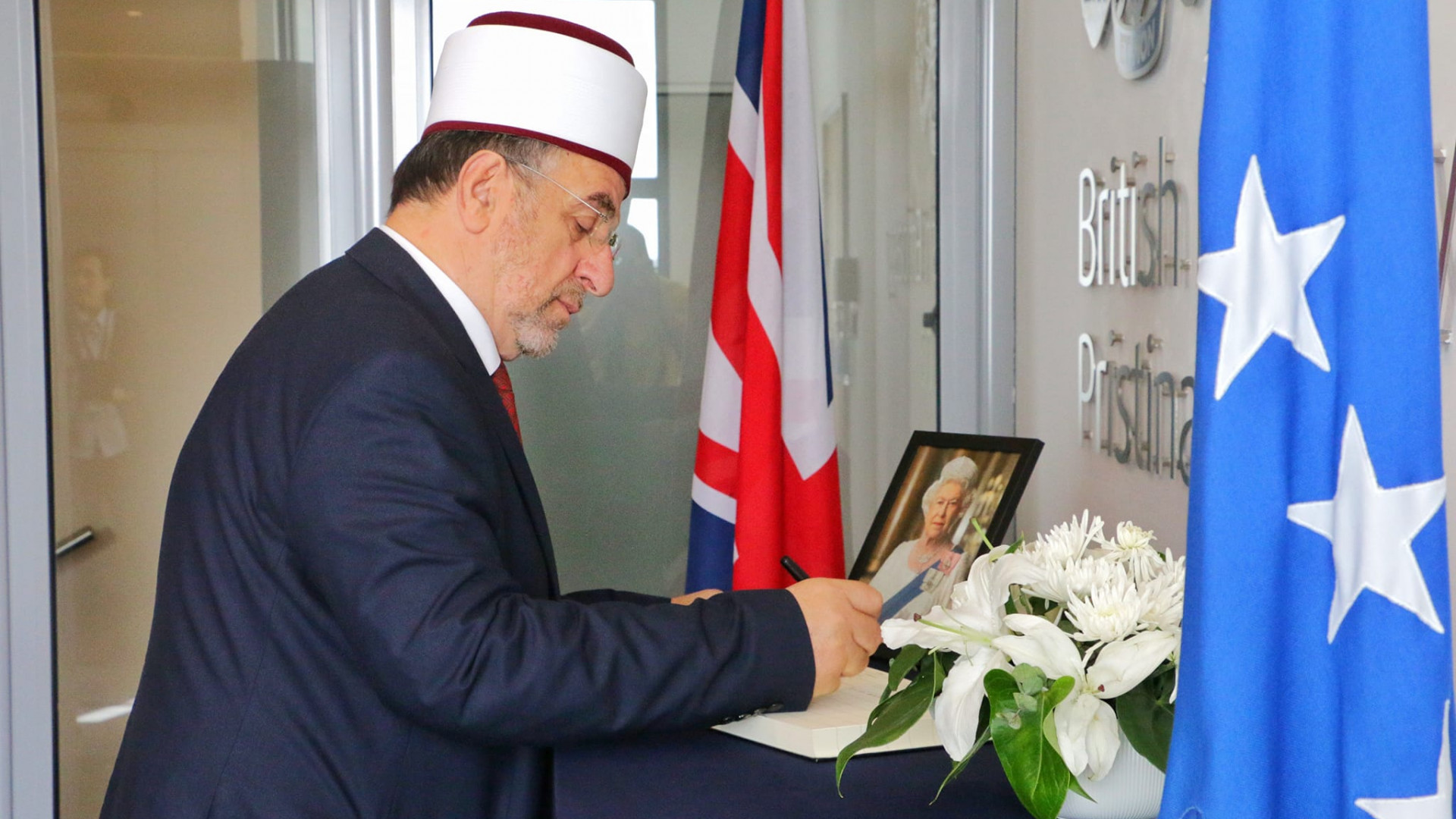 Kryetari i Bashkësisë Islame të Kosovës, Myftiu Naim ef. Tërnava, ka vizituar sot Ambasadën e Britanisë së Madhe, për të shprehur ngushëllime, me rastin e vdekjes së Mbretëreshës Elizabeth II, ku u prit nga ambasadori Nicholas Abbott.