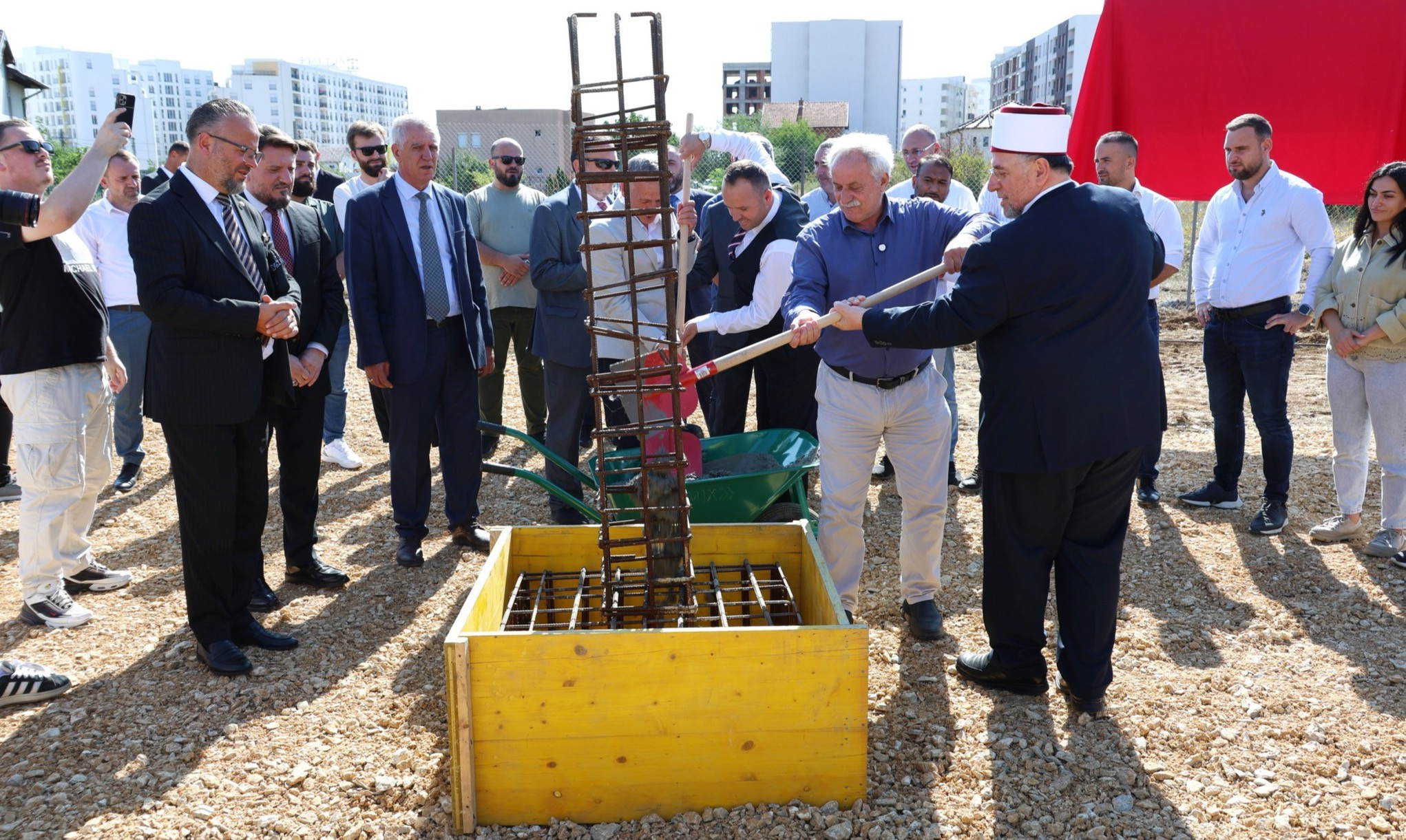 Në prani të Myftiut të Kosovës, Naim ef. Tërnavës dhe bashkëpunëtorëve të tij, kryetarit të Fushë Kosovës, z. Burim Berisha, përfaqësuesit të Shoqatës së Katarit, Ahmed al Ashal, kryetarit të Këshillit të BI-së së Fushë Kosovës, Valon ef. Ibrahimit, si dhe përfaqësuesve të tjerë institucional, sot, nën këndimin e tekbireve, në mënyrë solemne u vu gurthemeli i xhamisë së re në Fushë Kosovë.